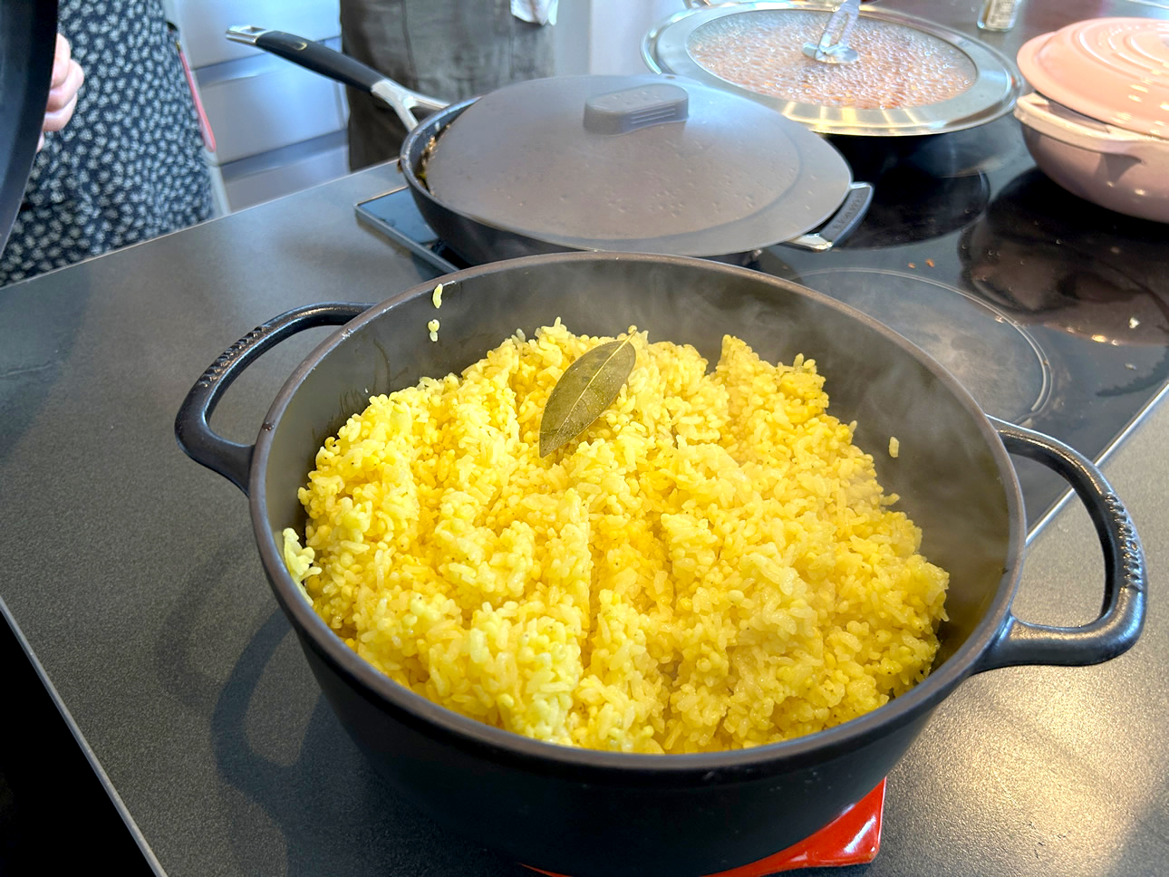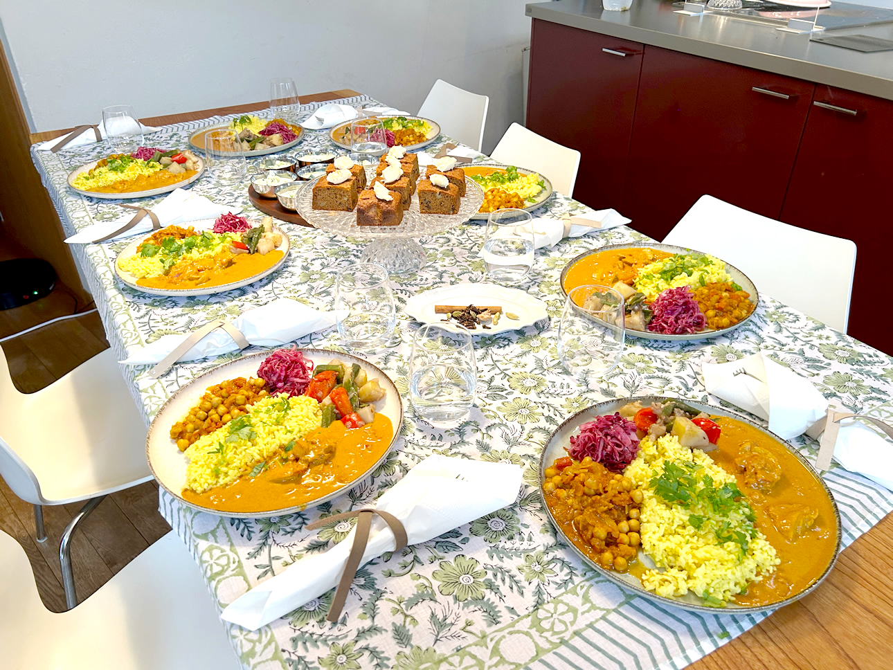 北島さんのレッスンには、長年通っている生徒さんが多く、実習や片付けの段取りもみなさん息がぴったりです。北島さんが調理のポイントを説明しながら、みなさんで段取りよく作業を進め、調理後は、全員でテーブルを囲んで完成したメニューを談笑しながらいただきました。「ソルガムきび粒入り雑穀のターメリックライス」は、ソルガムきびのプチプチした食感がカレーにマッチして、みなさんにも大好評でした。